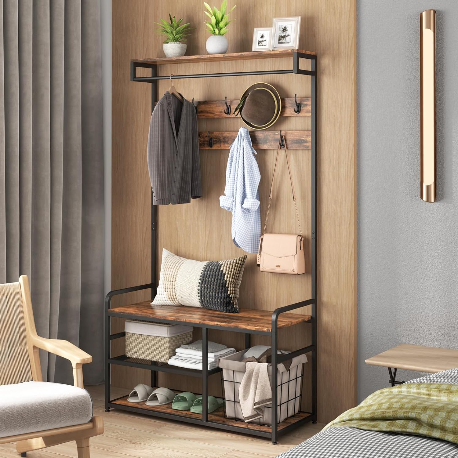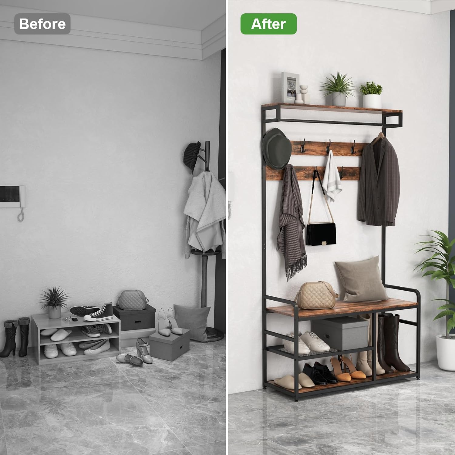 Hall Tree with Bench and Shoe Storage, 39.4in Entryway Hall Tree with Shoe Storage, Coat Rack Shoe Bench with Storage, Coat and Shoe Rack with 9 Hooks, Entryway Bench with Coat Rack, Brown