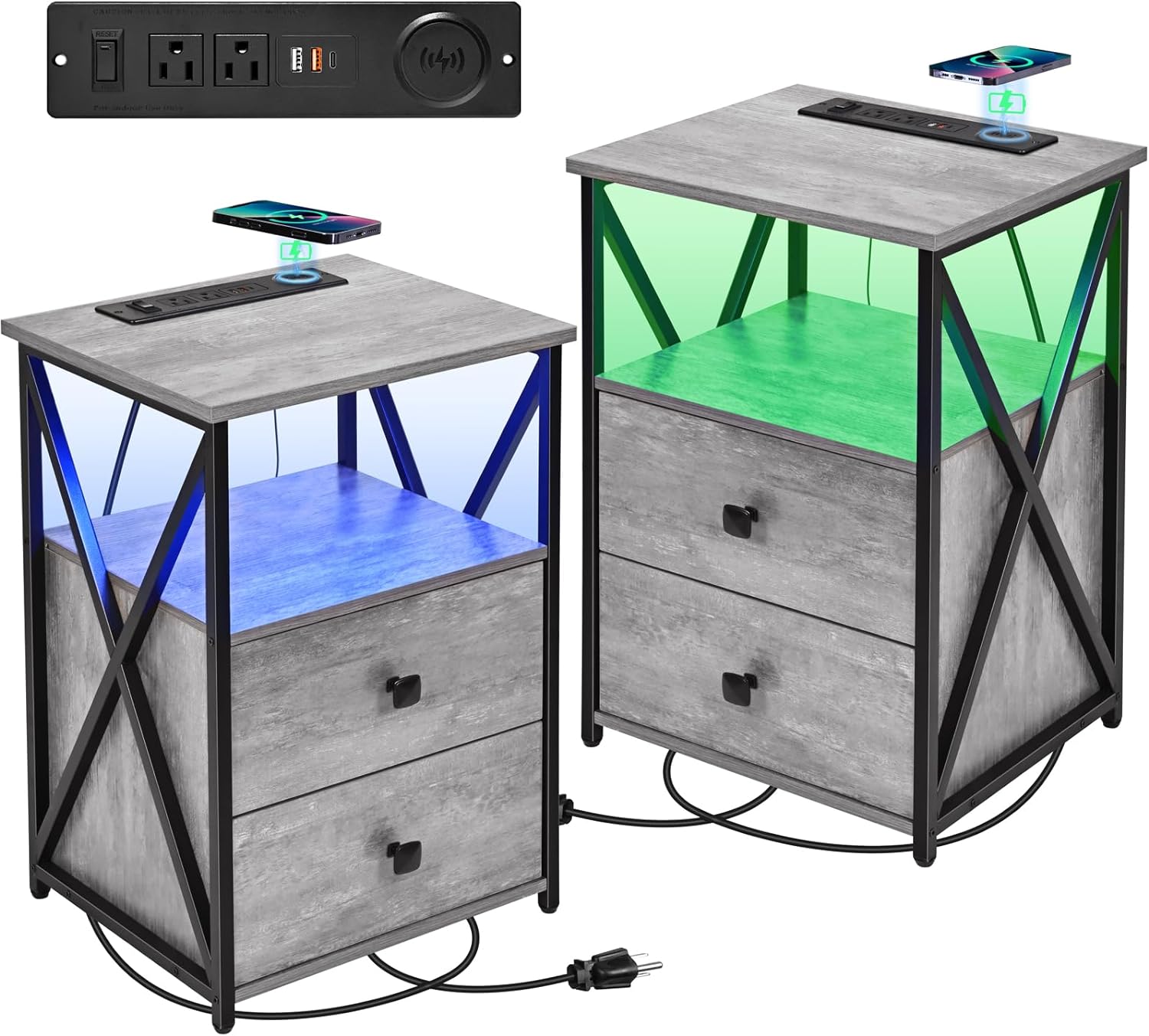 - Night Stand with LED Lights: This nightstand set of 2 for bedroom comes with color-changing LED light, giving thousands of colors, more than 20 speed modes and about 100 brightness. They’re controlled by remote control or APP. It can also flash to musical rhythms.