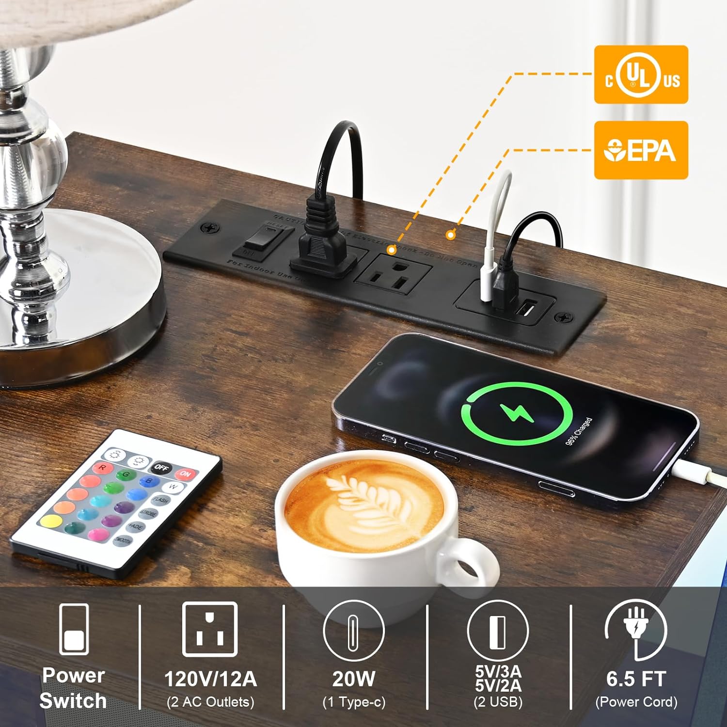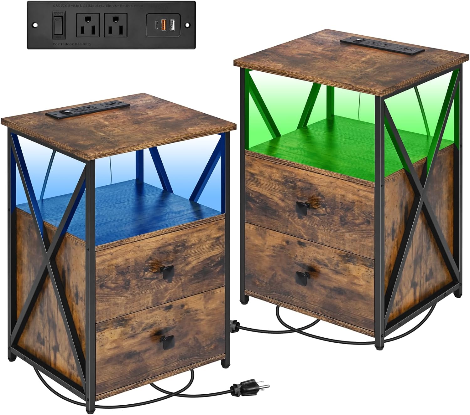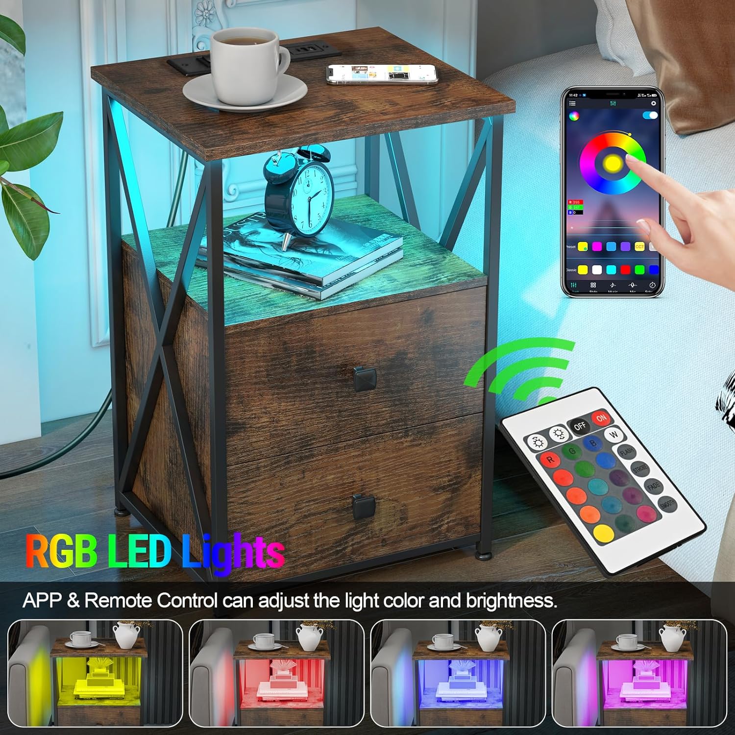 Livofloral Nightstand with Charging Station, LED End Table with Storage, Side Table with USB Ports and Outlets, Bedside Table with Wooden Storage Drawers and Shelves for Bedroom, Living Room, Brown